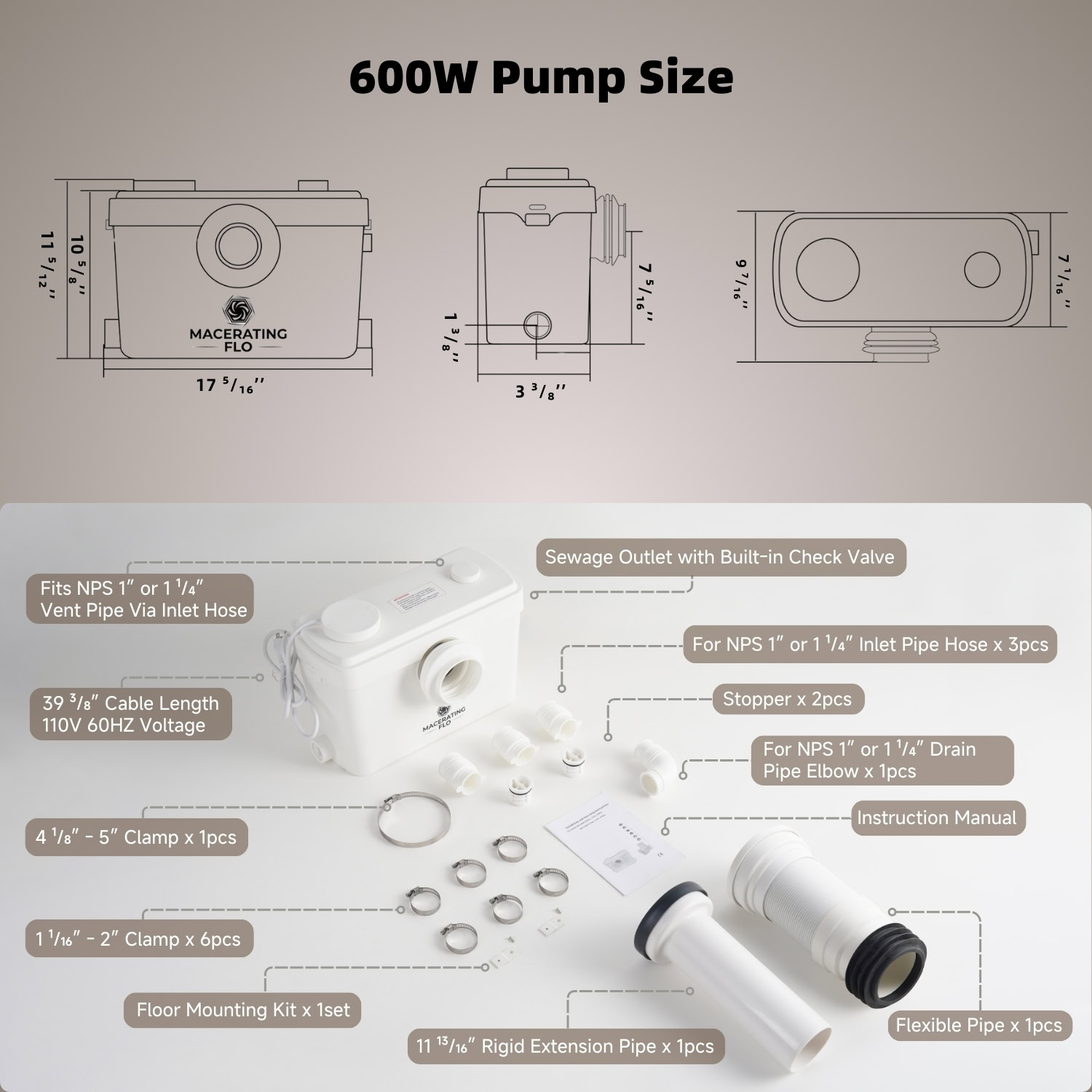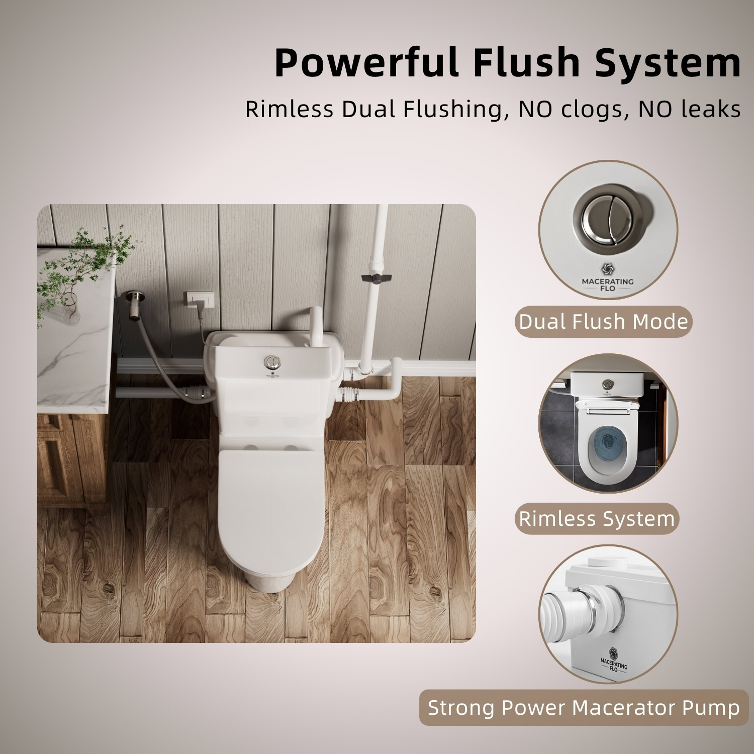 MaceratingFlo 600W macerating toilet system offers powerful waste disposal with a 3450 RPM pump and a 360˚ flush for thorough cleaning. Designed for versatility, the upflow toilet includes two types of extension pipes and multiple inlets, allowing connections to sinks, washers, or tubs, ideal for compact spaces. Installation of the basement toilet is straightforward with all necessary accessories and a detailed guide. Operating quietly, the macerator pump features Class 155(F) insulation and an IP55 enclosure for durability. This upflush toilet is ADA-compliant with an 18″ seat height, providing ergonomic comfort, especially for seniors or those with mobility issues. Its dual flush system conserves water, offering 0.8 GPF for liquids and 1.28 GPF for solids, making it efficient and environmentally friendly. For those looking for a reliable macerating toilet solution, this model provides exceptional performance while fitting seamlessly into any modern bathroom.