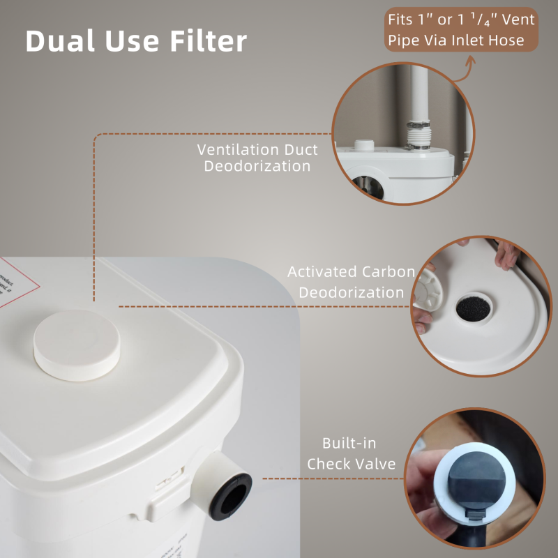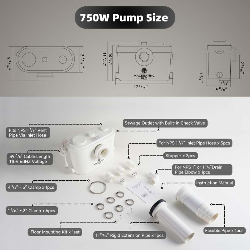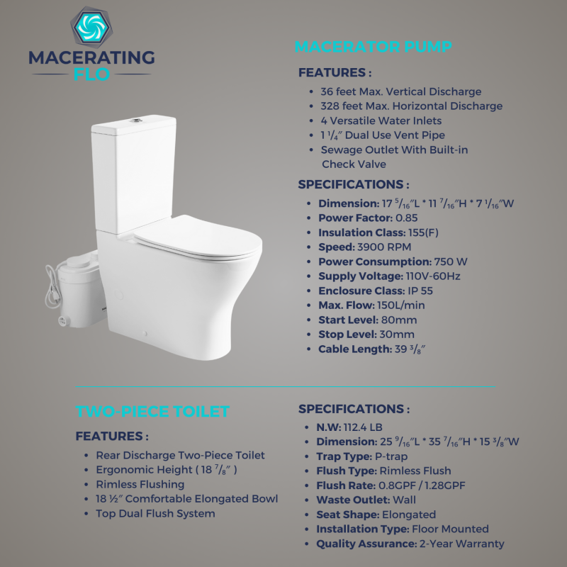 The MaceratingFlo ARES 750W macerating toilet offers an advanced solution for adding bathrooms in non-standard locations. This upflush toilet provides user comfort with its 18-inch high, elongated seat, and a convenient quick-release, soft-close feature. The sleek design of this two-piece toilet, along with its easy maintenance, complements any modern bathroom decor. The highlight of the system is the robust 750W macerator pump. The upflow toilet operates at an impressive speed of 3900 RPM and a maximum flow rate of 150L/min, ensuring efficient waste disposal. Capable of a substantial 36-foot vertical lift, it’s perfect for installations in basements or upper levels. The macerator maintains a quiet operation, providing a serene bathroom atmosphere. Equipped with four water inlets, it offers flexibility in plumbing setups. This macerating toilet system, with its powerful pump and comfortable toilet, is perfect for easily adding a complete bathroom in areas where regular plumbing is difficult.