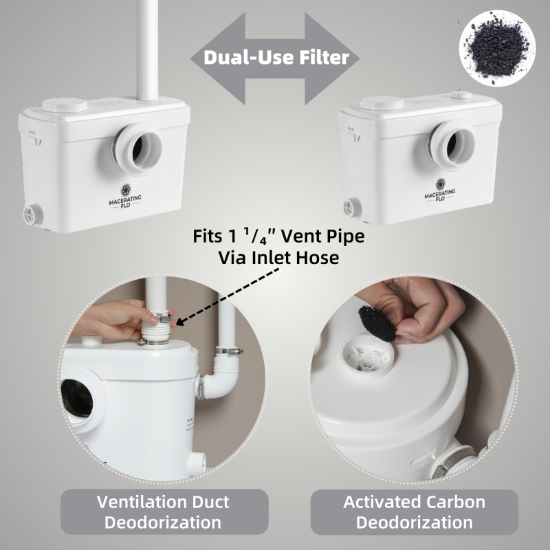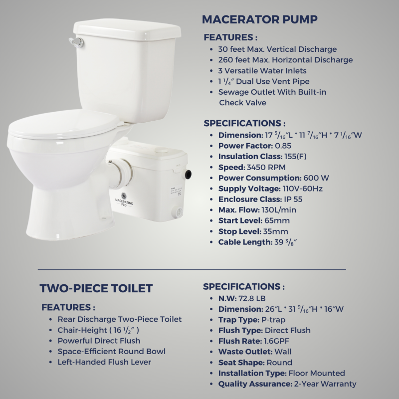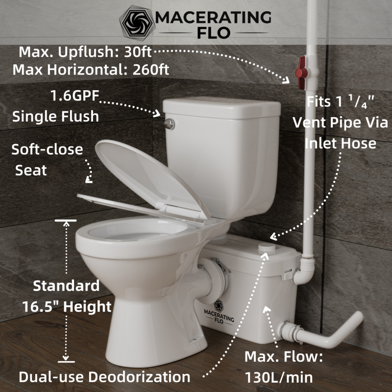 Experience the perfect balance of power and function with the MaceratingFlo Pro macerating toilet system. Powered by a robust 600W motor, this upflow toilet effortlessly handles waste disposal. Its high-speed 3450 RPM pumping capacity and a 30-foot maximum lift make it a reliable solution for basement toilet installations and other areas with challenging plumbing conditions. With wide-ranging functionality, this upflush toilet can manage waste from toilets, showers, sinks, and washing machines with ease. It’s an ideal choice for homes with low-pressure systems, narrow pipes, or basements, allowing wastewater to be effectively pumped upwards for unmatched flexibility. The high-quality build, certified by an IP55 enclosure class and Class 155(F) insulation, ensures its durability and long-lasting performance. Installation and maintenance have never been easier, the MaceratingFlo Pro system includes a free extension pipe and AC vent, eliminating the need for concrete cutting. The advanced macerator pump, featuring stainless steel blades, ensures effortless cleaning. Choose the MaceratingFlo Pro upflush toilet system for a powerful, quiet, and versatile waste management solution, ideal for the basement and other demanding spaces.