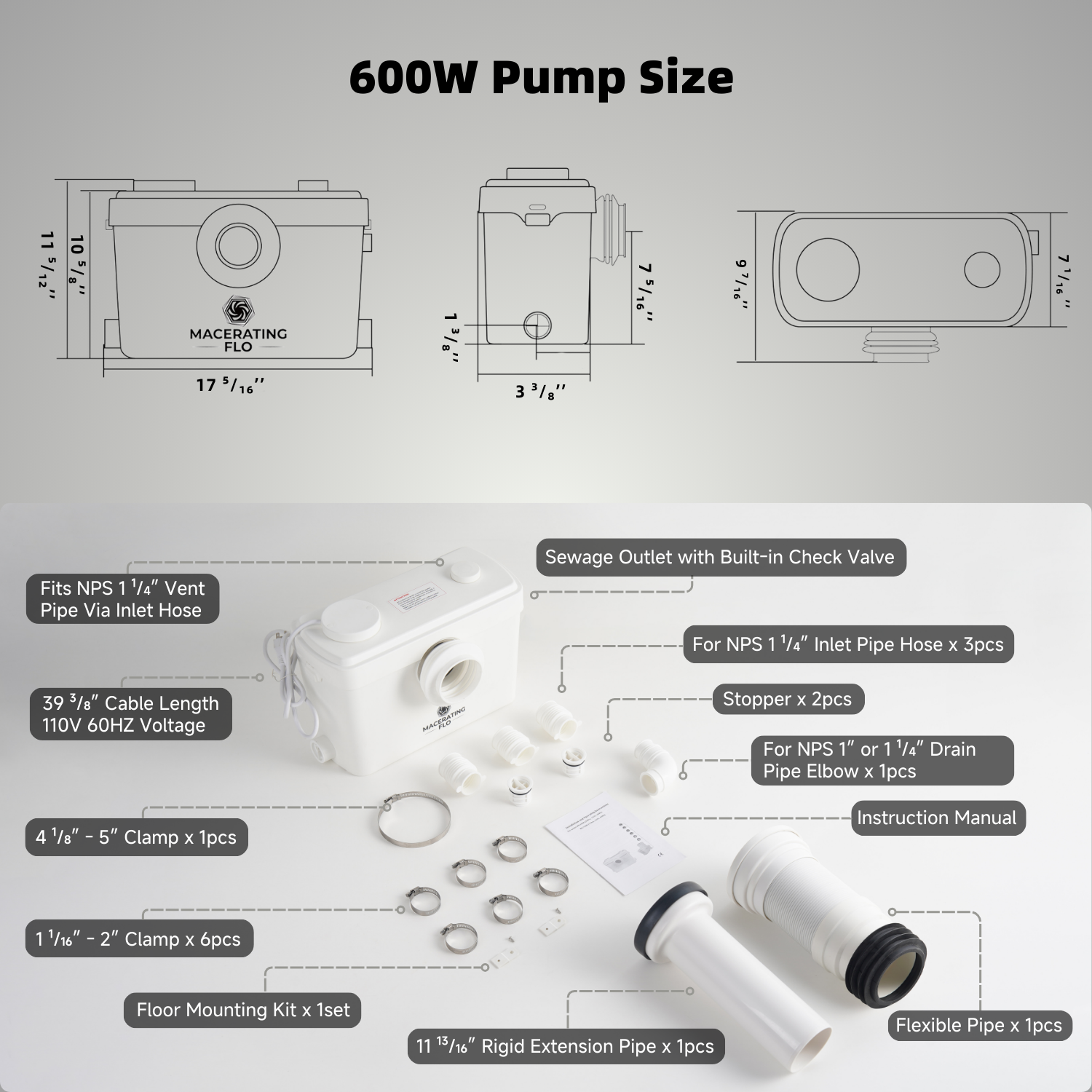 Experience the perfect balance of power and function with the MaceratingFlo Pro macerating toilet system. Powered by a robust 600W motor, this upflow toilet effortlessly handles waste disposal. Its high-speed 3450 RPM pumping capacity and a 30-foot maximum lift make it a reliable solution for basement toilet installations and other areas with challenging plumbing conditions. With wide-ranging functionality, this upflush toilet can manage waste from toilets, showers, sinks, and washing machines with ease. It’s an ideal choice for homes with low-pressure systems, narrow pipes, or basements, allowing wastewater to be effectively pumped upwards for unmatched flexibility. The high-quality build, certified by an IP55 enclosure class and Class 155(F) insulation, ensures its durability and long-lasting performance. Installation and maintenance have never been easier, the MaceratingFlo Pro system includes a free extension pipe and AC vent, eliminating the need for concrete cutting. The advanced macerator pump, featuring stainless steel blades, ensures effortless cleaning. Choose the MaceratingFlo Pro upflush toilet system for a powerful, quiet, and versatile waste management solution, ideal for the basement and other demanding spaces.