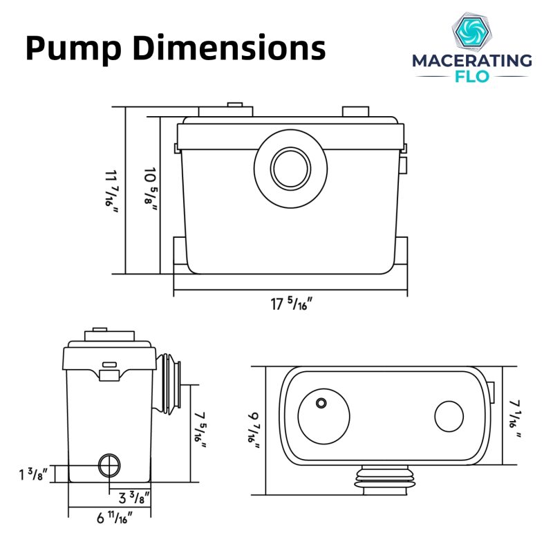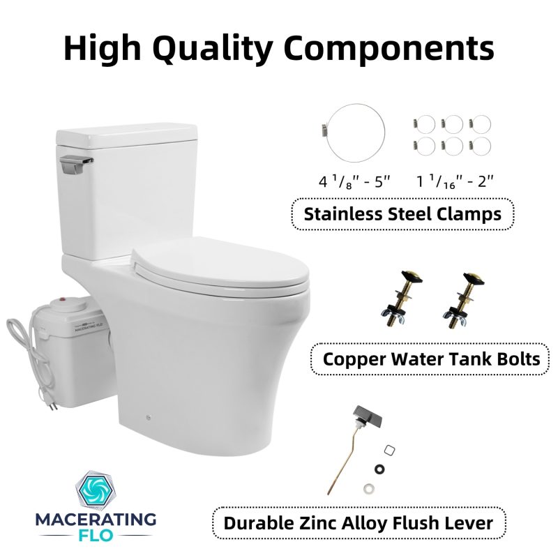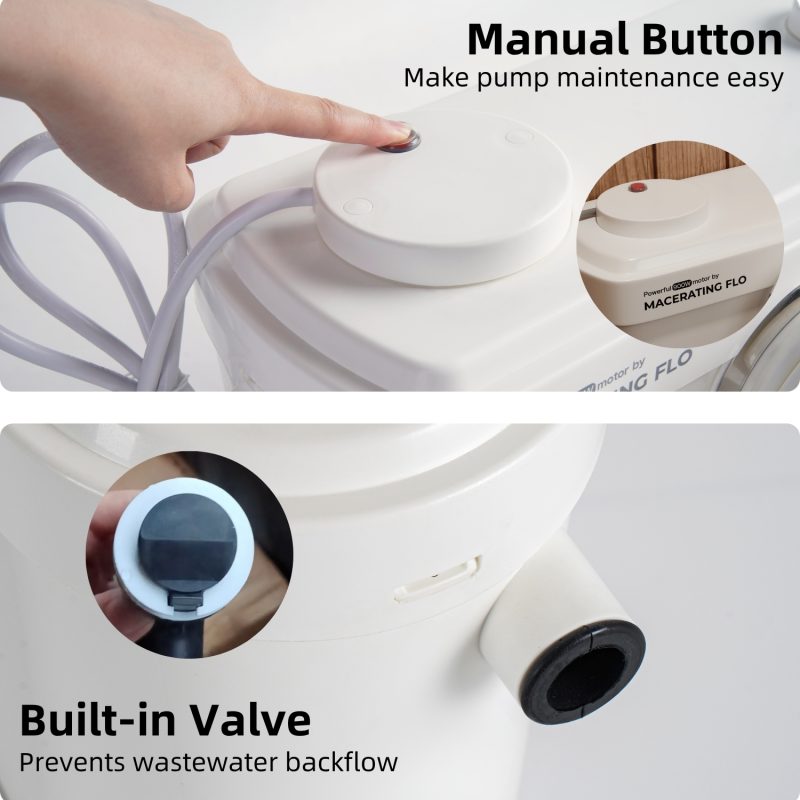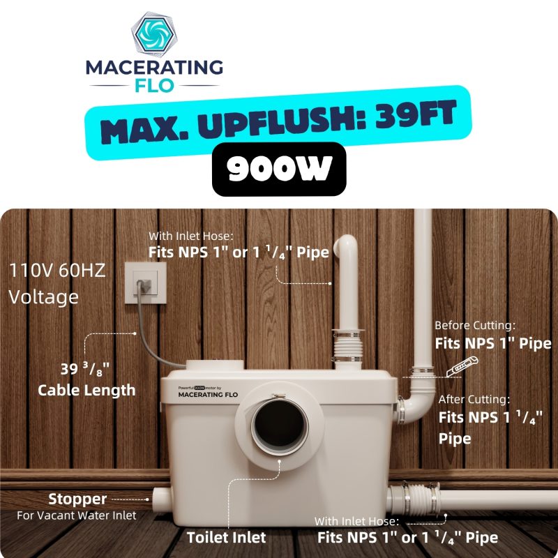 Enhance your home with the MaceratingFlo 900W Upflush Toilet System, designed for easy installation in basements, garages, or remote spaces without gravity plumbing. Its powerful 900W pump ensures efficient effluent transfer, making it ideal for complex bathroom layouts in any modern home. Built for versatility, this system supports upflush toilets and features four water inlets to connect sinks, showers, or bathtubs. Its quiet operation reduces noise and vibration, perfect for compact or under-stair bathrooms where tranquility matters. The sleek, compact design fits tight spaces while maintaining robust performance. Installation is streamlined with two extension pipes and a standard P-trap, accommodating unique plumbing setups. Engineered for durability, it includes overload protection and easy-access panels for hassle-free maintenance. Backed by a 2-year limited warranty and responsive customer support, this macerating toilet delivers a reliable, low-noise solution for stylish bathroom additions or renovations.