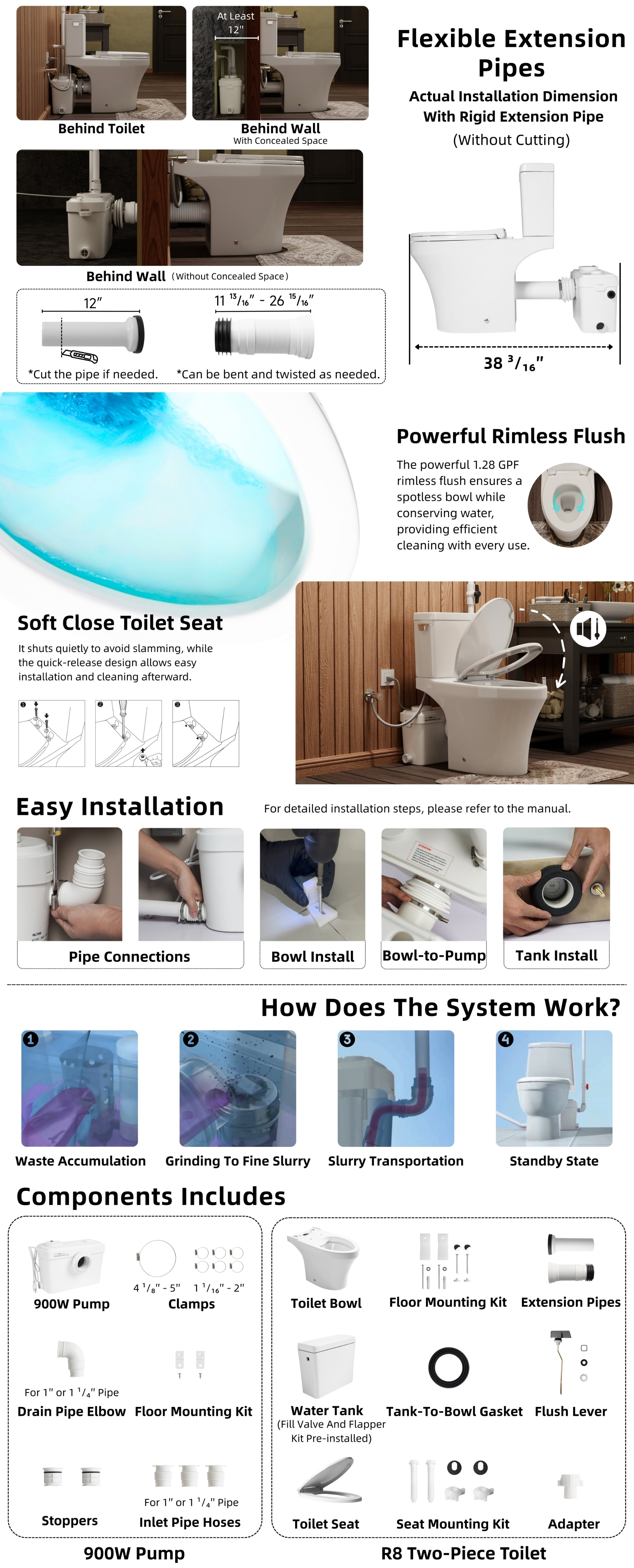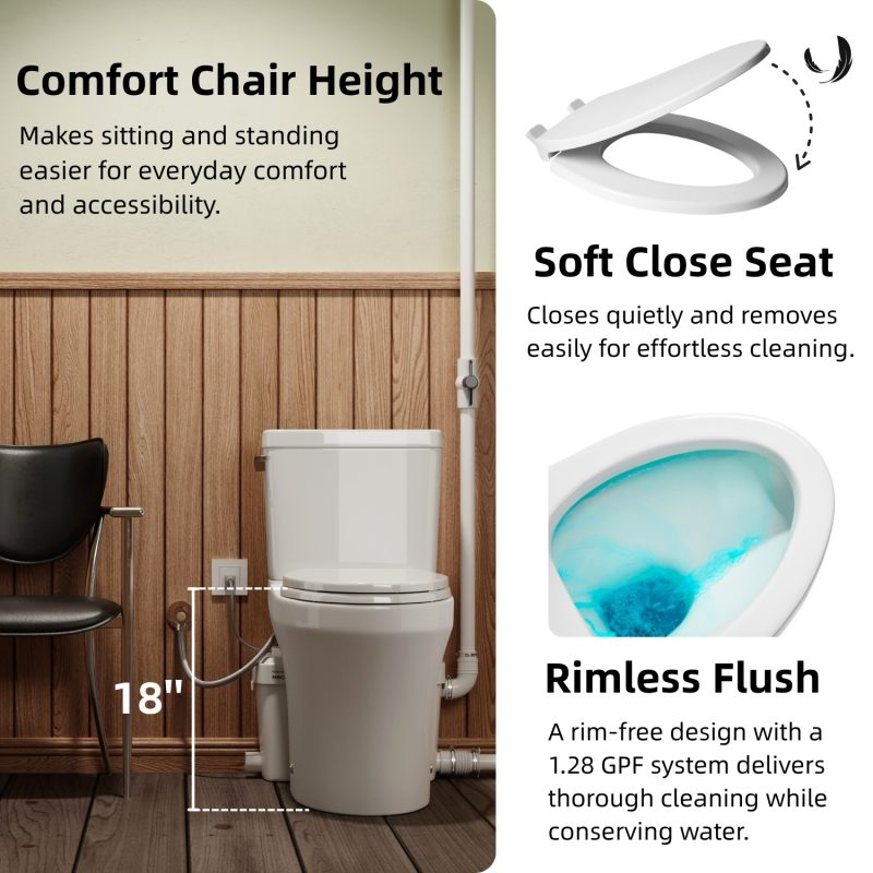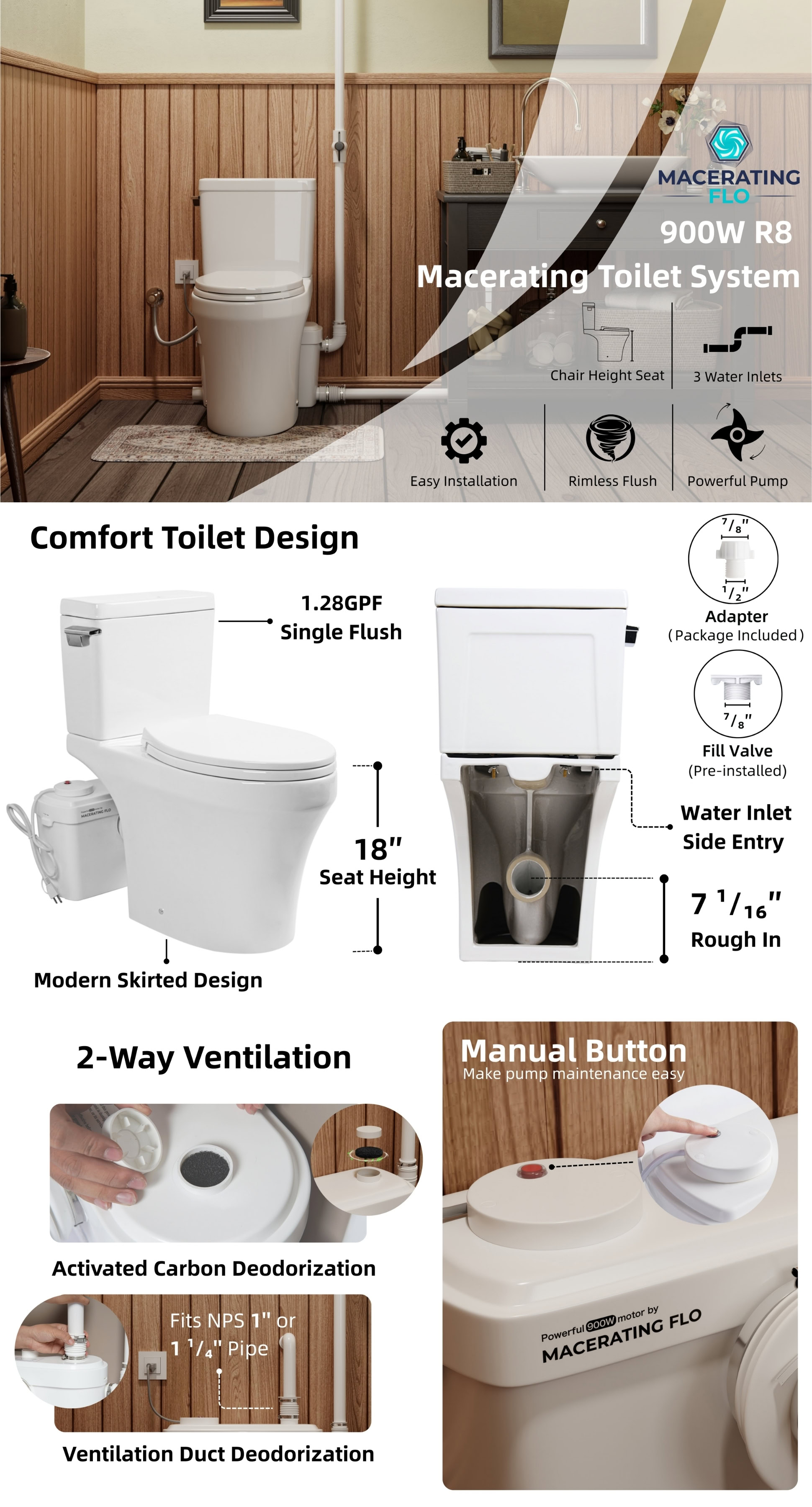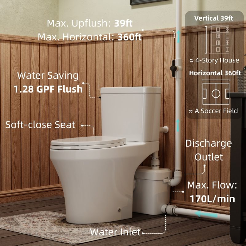 This 900W macerating toilet system delivers powerful upflush for basements, quiet operation, and easy installation with four inlets and a 2-year warranty.