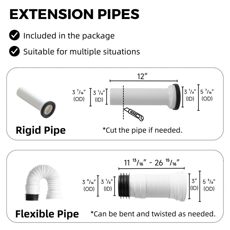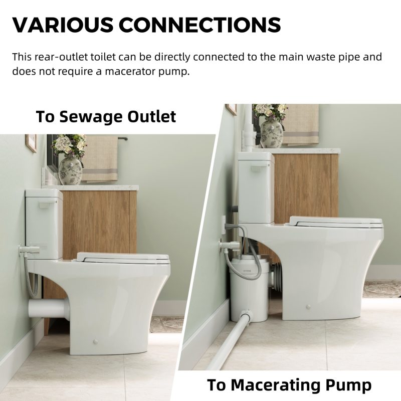 This rear-outlet toilet can be directly connected to the main waste pipe using the included extension pipe, and does not require a macerator pump.