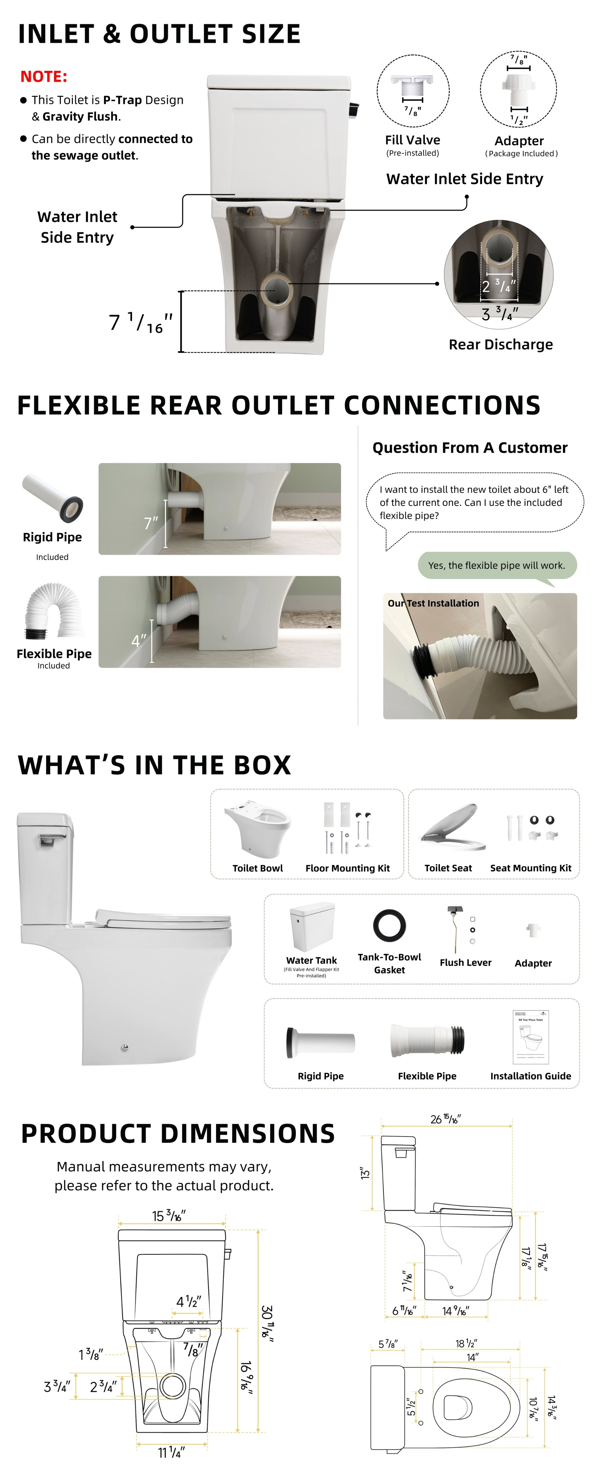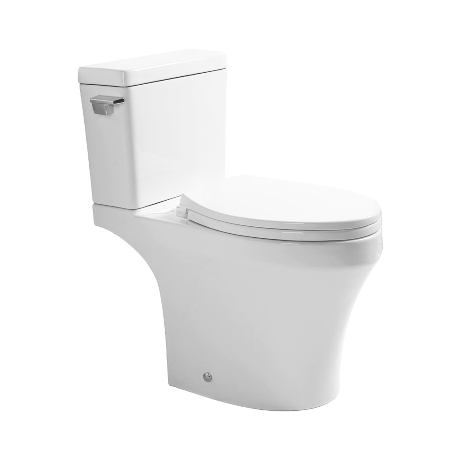 Crafted from high-gloss white ceramic, this durable two-piece P-trap toilet is built for long-term reliability. It includes a built-in P-trap and rear extension pipes, ensuring adaptable installation for a seamless fit into residential or light commercial environments.